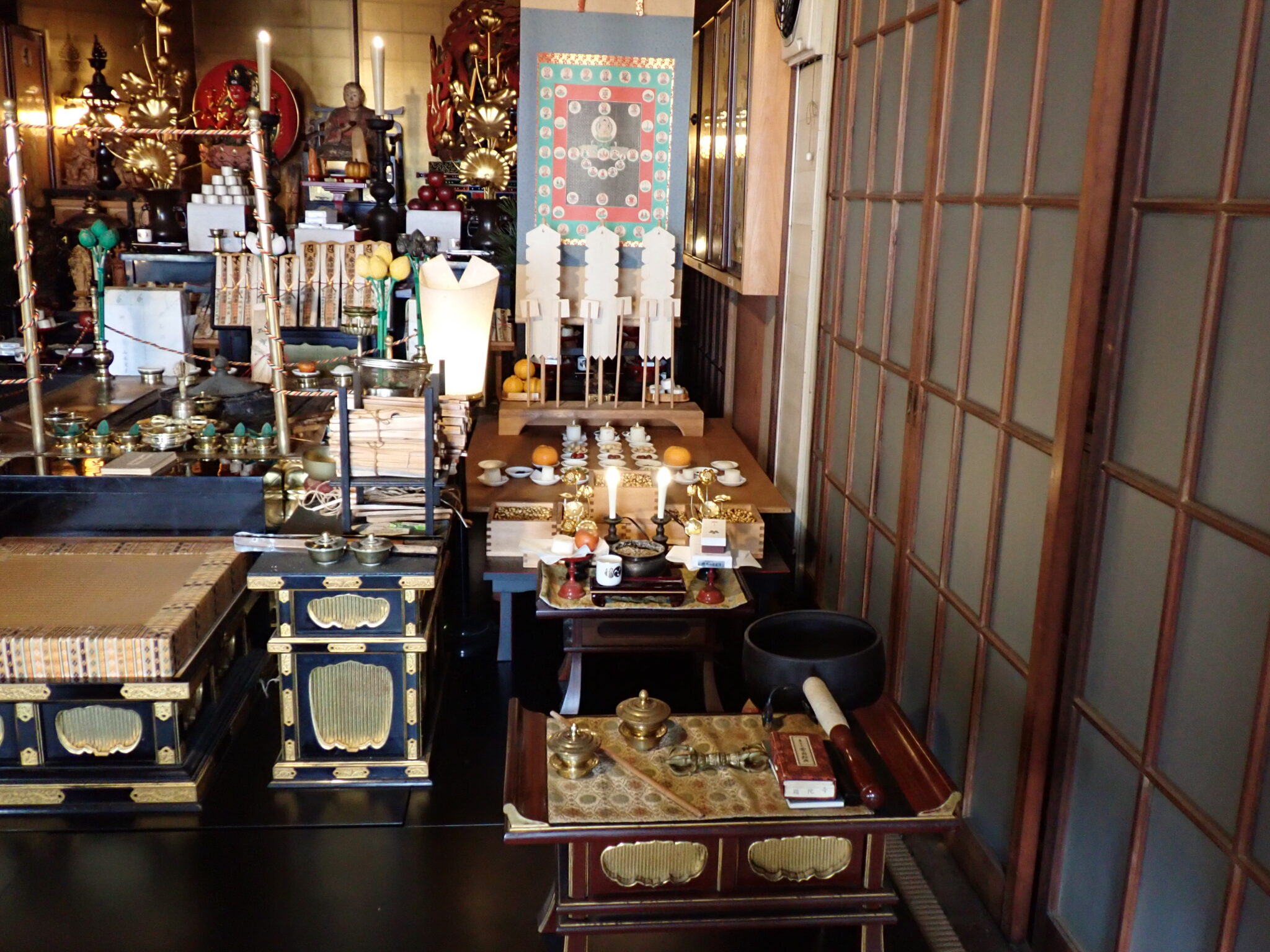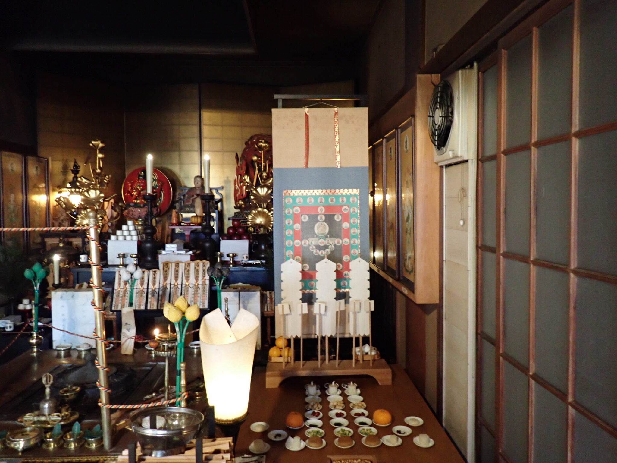 水(閼伽)、香、花、食物、燈明をお供えします。 -