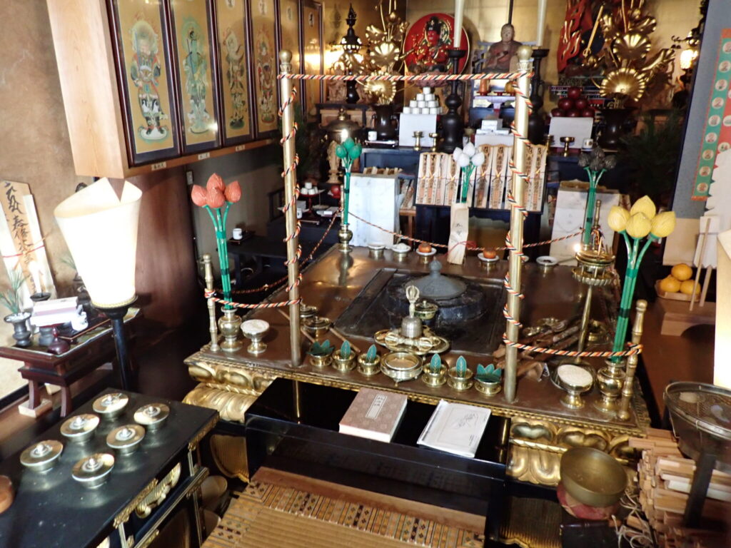 諸仏、諸菩薩を敬うため、亡き人を敬うために水(閼伽)、香、花、食物、燈明をお供えします。