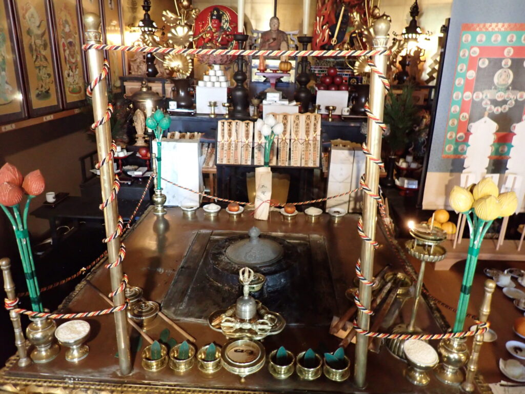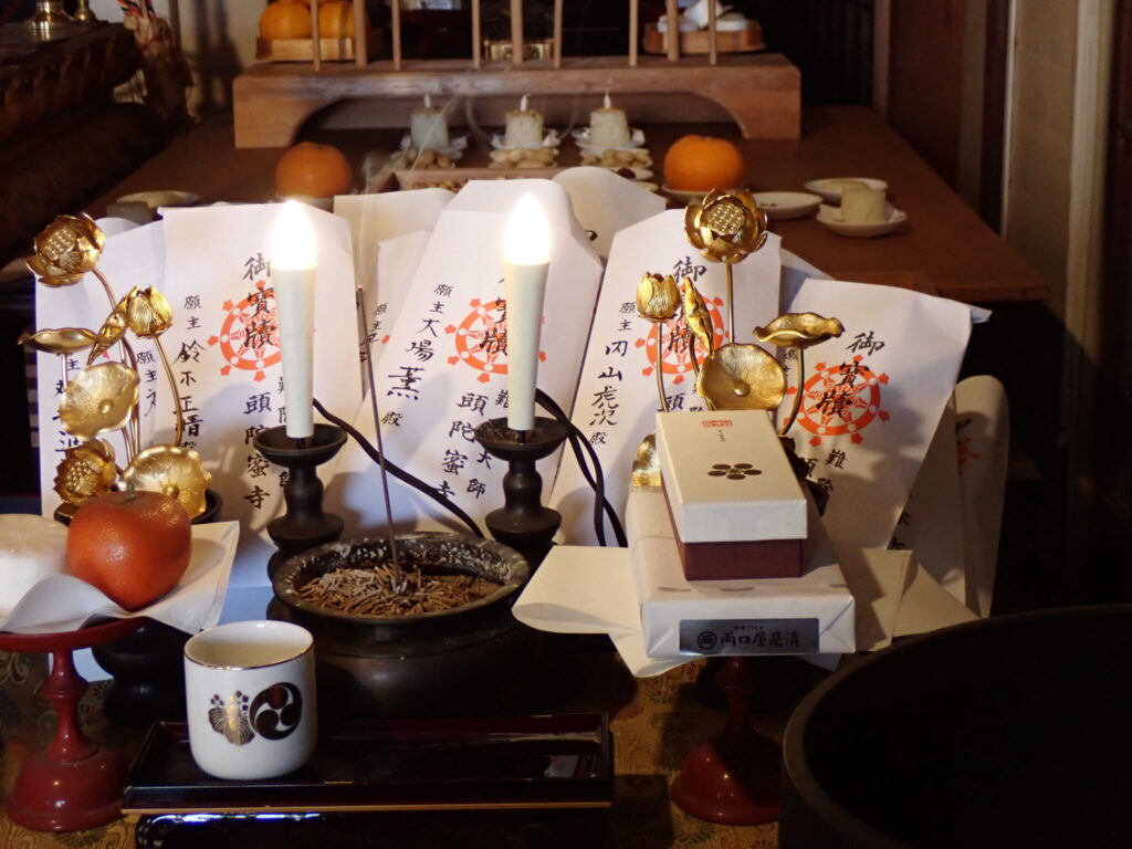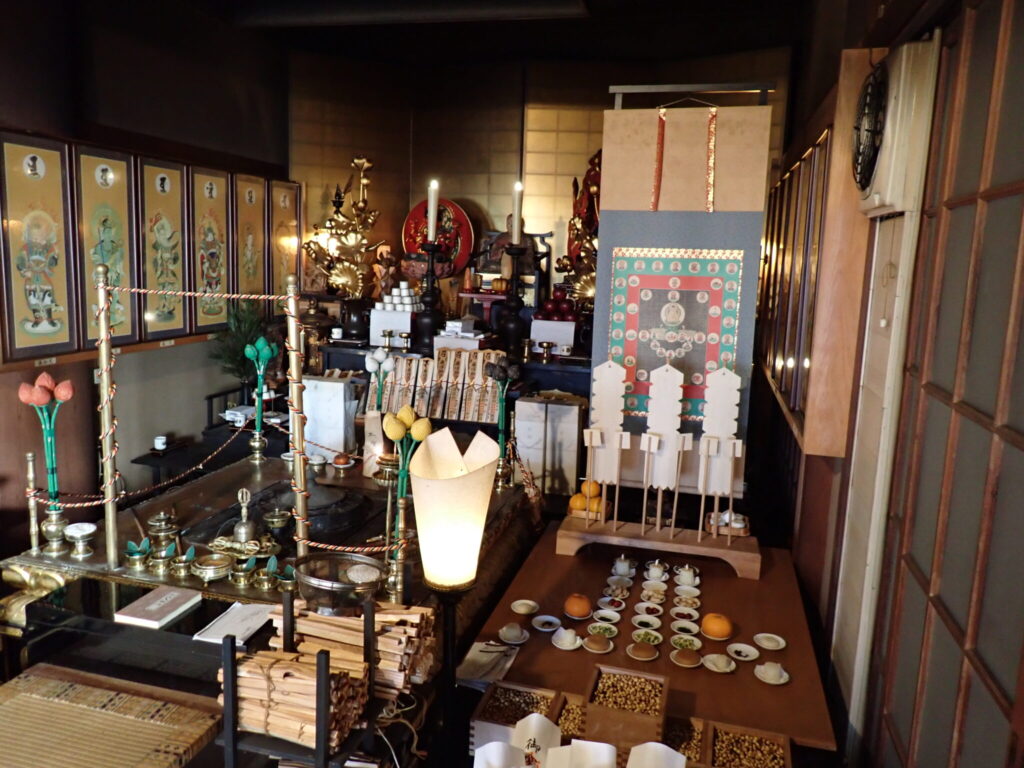 諸仏、諸菩薩を敬うため、亡き人を敬うために水(閼伽)、香、花、食物、燈明をお供えします。