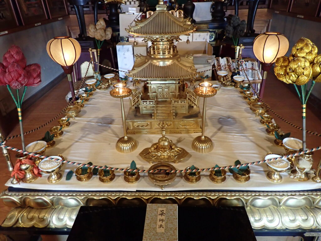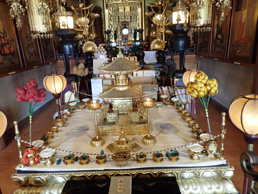 諸仏、諸菩薩を敬うため、亡き人を敬うために水(閼伽)、香、花、食物、燈明をお供えします。