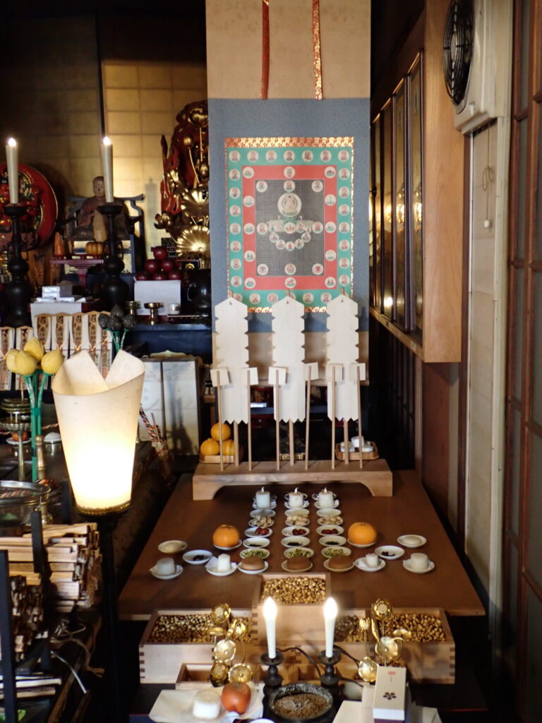 水(閼伽)、香、花、食物、燈明をお供えします。